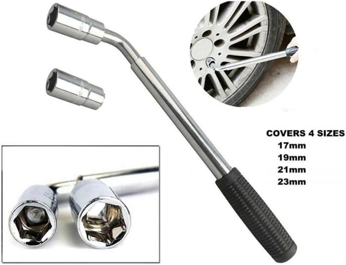 - مفتاح فك وربط مسامير اطارات كاوتش عجل السيارة – يد قابلة للتعديل مع لقمة مقاس 17/19/21/23 مم – مقبض مريح ومفتاح عملى مفيد